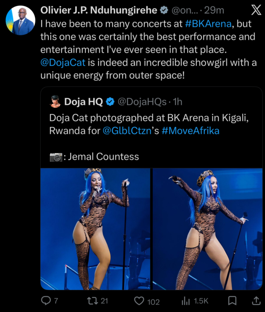 KIGALI – RWANDA Doja Cat performed at BK Arena in Kigali on the night of March 17, headlining the third edition of Move Afrika Global Citizen’s touring concert series and left at least one senior government official speechless. Rwanda’s Minister of Foreign Affairs, Olivier Nduhungirehe, was in the crowd and did not hold back.